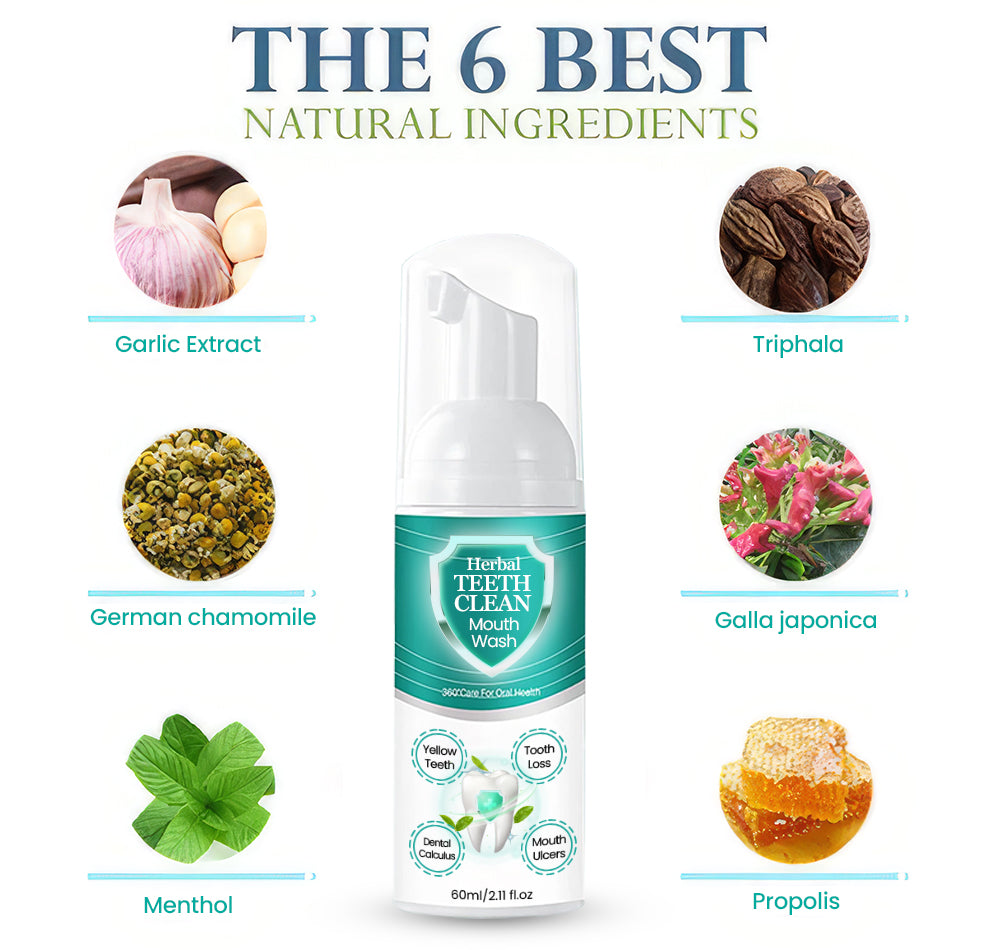 Herbal TEETHClean Mouthwash is the latest product certified by the American Dental Association and recommended by dentists. It can perfectly solve all oral problems, including dental calculus, bad breath, oral ulcers, dental caries, bleeding gums, tooth sensitivity, gingivitis, loose teeth, periodontitis, swollen gums, tooth damage, tooth loss, etc. No side effects. Made from 100% natural herbs. Suitable for everyone, including children, young people, and the elderly.