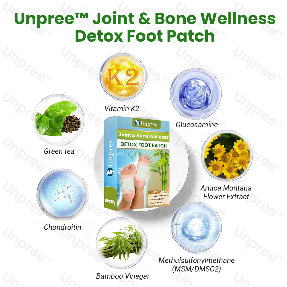 Discover optimal joint and bone health with Unpree™ Joint & Bone Wellness Detox Foot Patch.. Our advanced formula combines natural ingredients like Bamboo Vinegar, Vitamin K2, Green Tea, Glucosamine, Arnica Extract, Methylsulfonylmethane (MSM), and Chondroitin to target joint pain, arthritis, joint injuries, and gout.